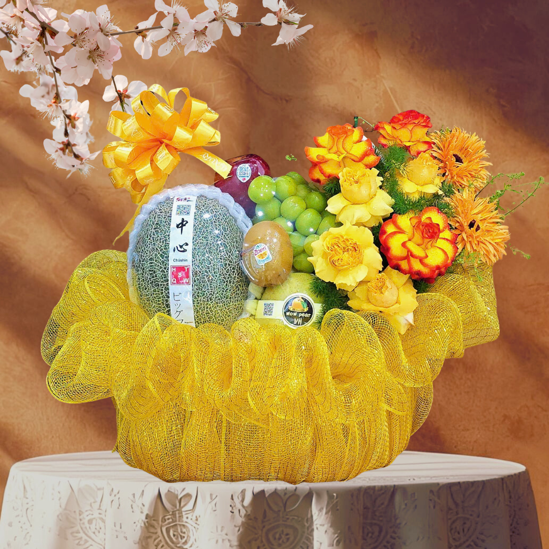 Hoa tươi rực rỡ tượng trưng cho phú quý và thịnh vượng, khi kết hợp cùng các loại trái cây nhập khẩu sẽ tạo nên món quà sang trọng, gửi lời chúc “làm ăn phát đạt, vạn sự như ý”.