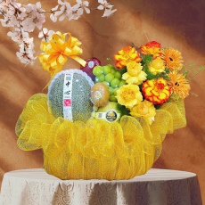 Giỏ hoa quả/ Giỏ trái cây có hoa tươi sáng, giúp món quà trở nên ấn tượng và mang thông điệp tốt lành. Sắc vàng hồng của các loại hoa còn tượng trưng cho sự thành công, tài lộc và may mắn, vì vậy rất được ưa chuộng trong các dịp khai trương, chúc mừng, tri ân hoặc thăm hỏi.