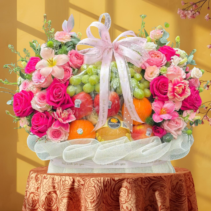 Hoa tươi rực rỡ tượng trưng cho phú quý và thịnh vượng, khi kết hợp cùng các loại trái cây nhập khẩu sẽ tạo nên món quà sang trọng, gửi lời chúc “làm ăn phát đạt, vạn sự như ý”.